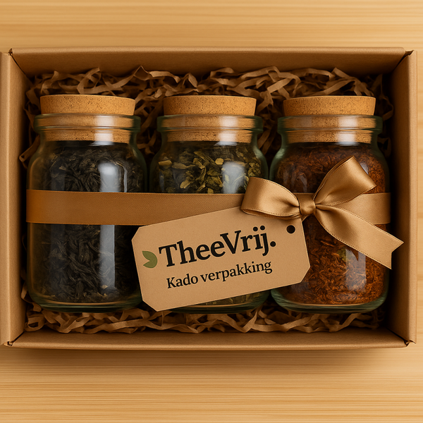 Thee in glazen potjes met van 3x 30 gram theekruidenmix. Leuk als kado. Kies uit de thema's: warme winter thee, voorjaarsproeverij of zelf te kiezen. (Voorkeur kan opgegeven worden bij de opmerking in het bestelformulier.)